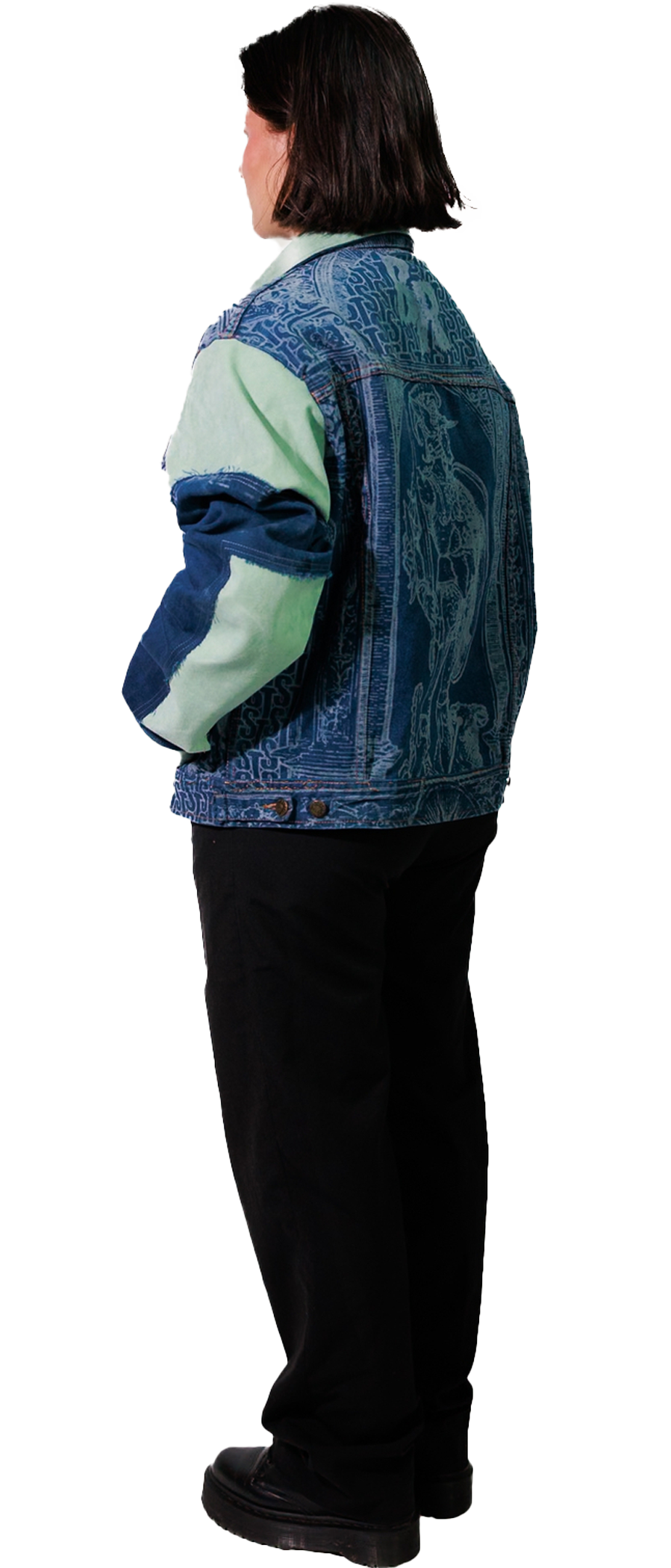 This upcycled, blue-dyed denim jacket features a laser-etched Renaissance motif, created in collaboration with Bleached Renaissance. The cropped, boxy silhouette adds bold structure, while eco-conscious Alcantara details at the sleeves, collar and cuffs bring a refined, soft contrast.