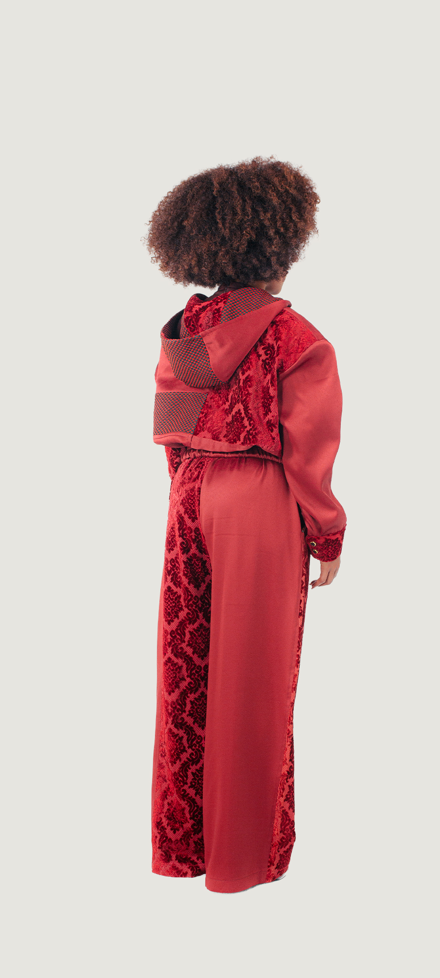 Gemaakt van tweedehands gordijnen en rest materialen van meubelmakers.
